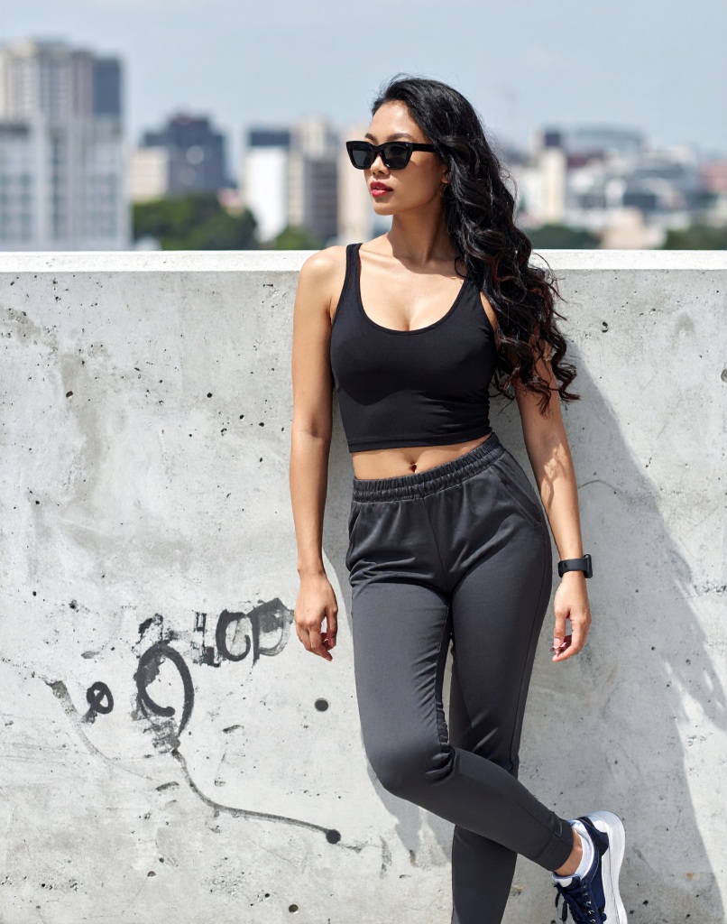 Prompt : “Hyper-realistic 8K full-body shot, slightly low-angle medium shot on a 35mm lens, shows a confident young woman (exact face from uploaded image) leaning against a textured concrete wall. She has long dark curly hair, black sunglasses, and wears a sleeveless deep-neck, figure-hugging top with visible bust cleavage and navel, paired with dark grey slim-fit jogger pants and white sneakers with dark blue accents. A black watch is on her left wrist. Her head is turned slightly right, looking away”